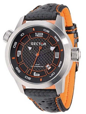 Quartz Miyota 2415 movement/Stainless steel case (48 mm)/Screw-down case back/Additonal crown for turnable inner ring/Orange/black dial/Leather strap/Mineral crystal/Date/Water resistant to 100 mt